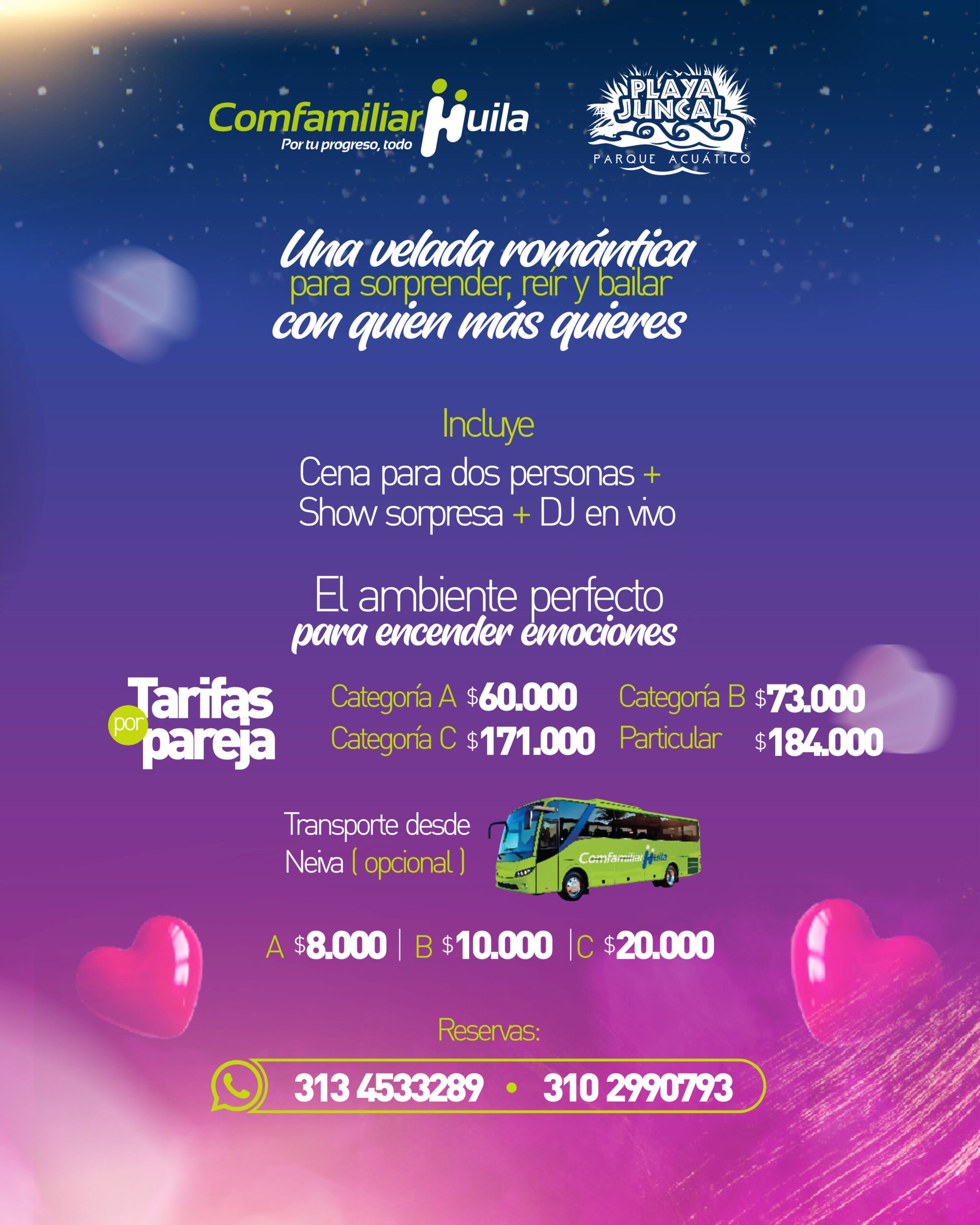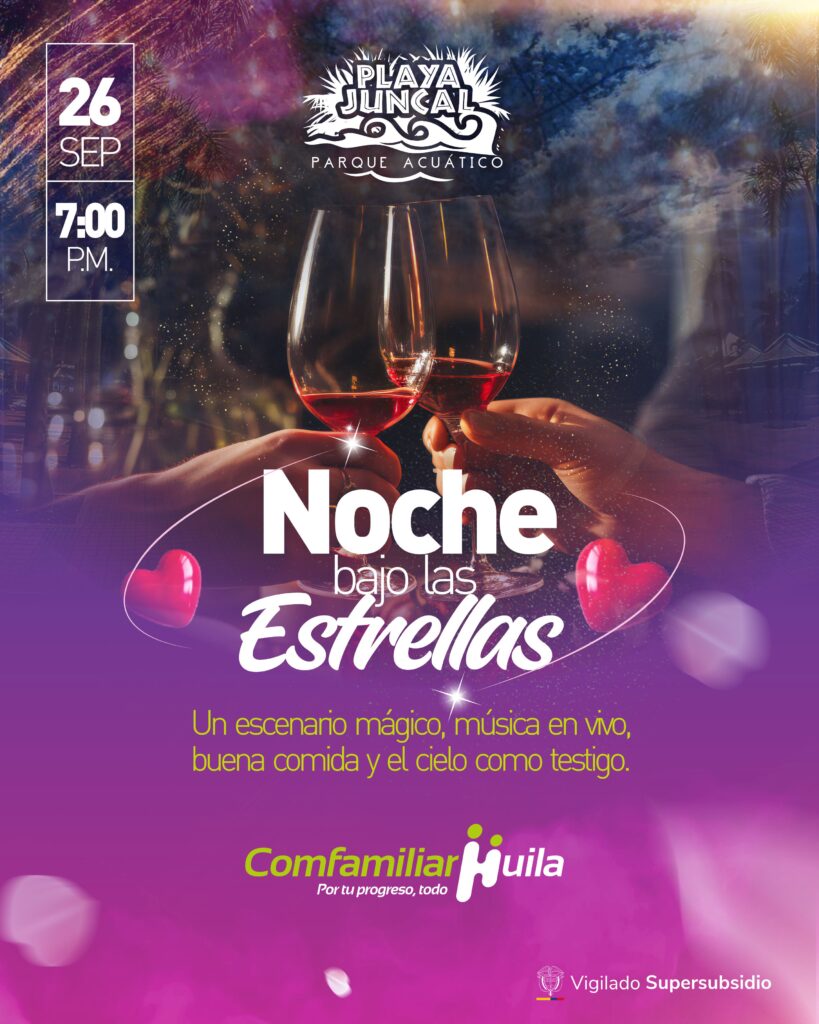 Comfamiliar Huila invita a todos sus afiliados y a la comunidad en general a disfrutar de una velada inolvidable en el Parque Acuático Playa Juncal, el próximo 26 de septiembre a partir de las 7:00 p. m.